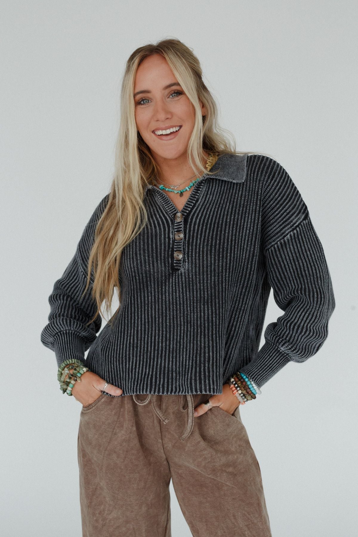 Classic collared Henley neckline with dropped shoulders, long sleeves and 3/4 button closure