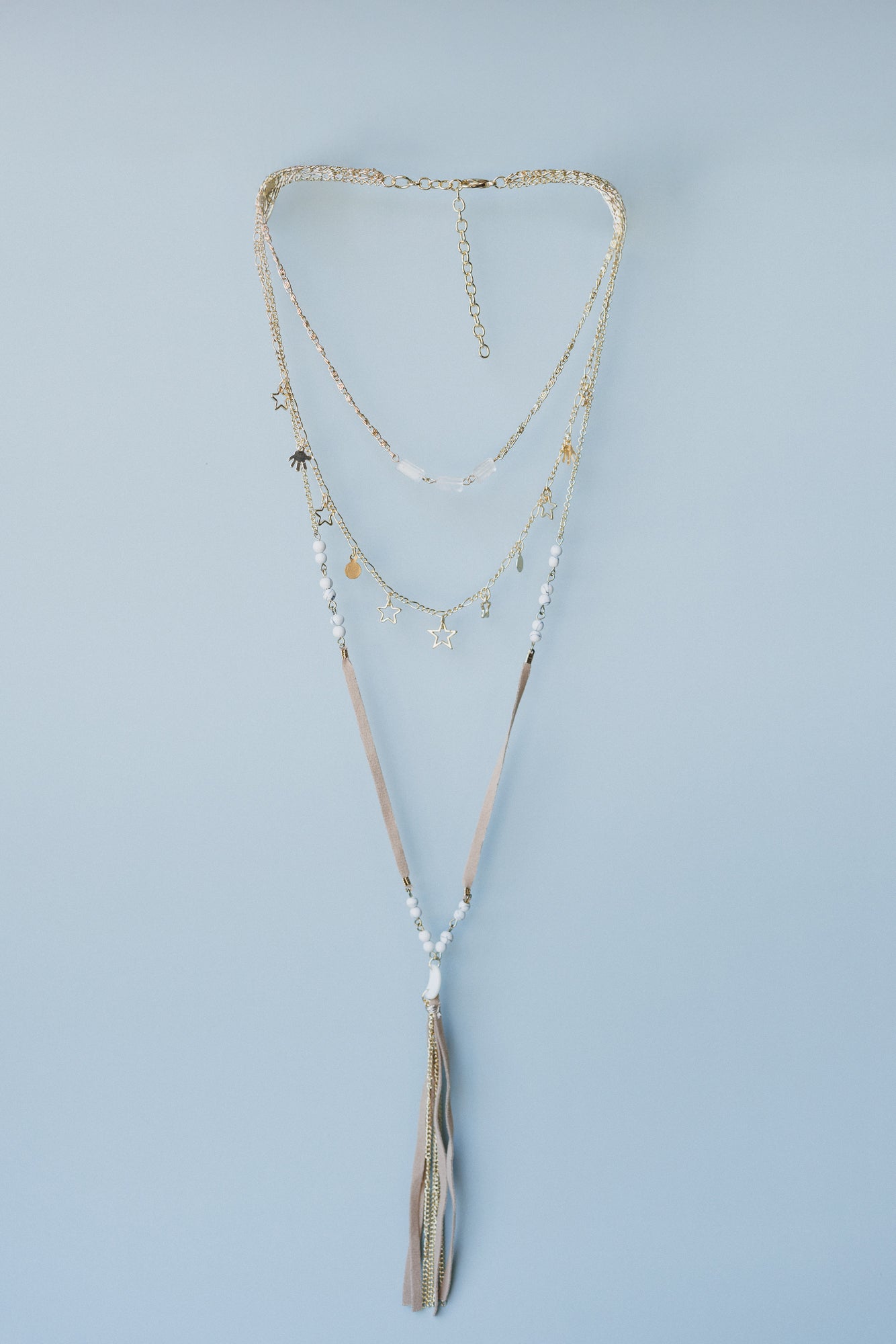 - Add texture and shine to any evening look with this ornate layered necklace.
