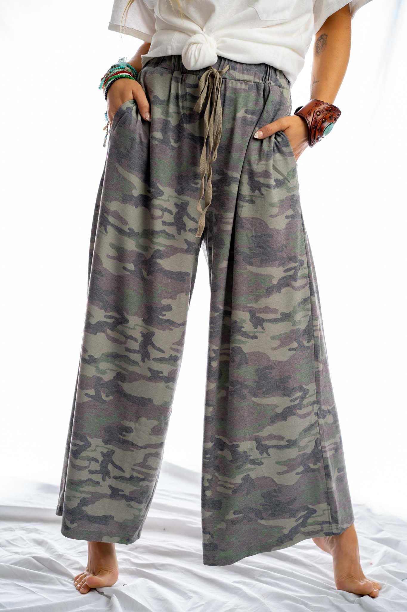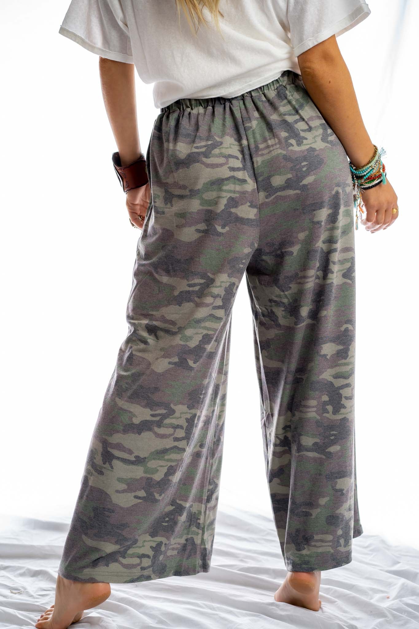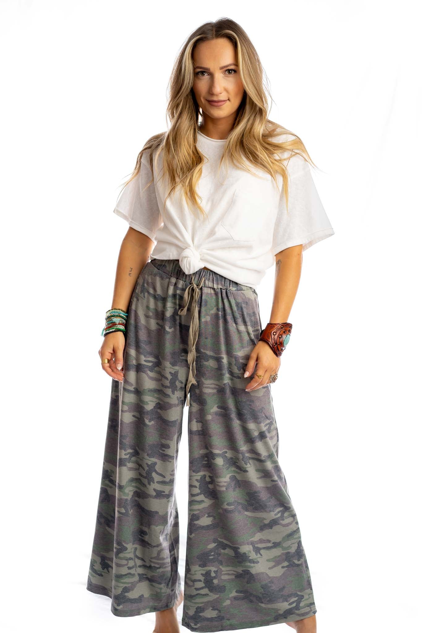 We've got you covered with our Calling All Camo pants! This lounge pant features a washed camouflage print in a wide leg silhouette, a drawstring waistband and pockets. Style them with a classic white tee or our Calling All Camo Lounge Top for a comfy and cool matching set!