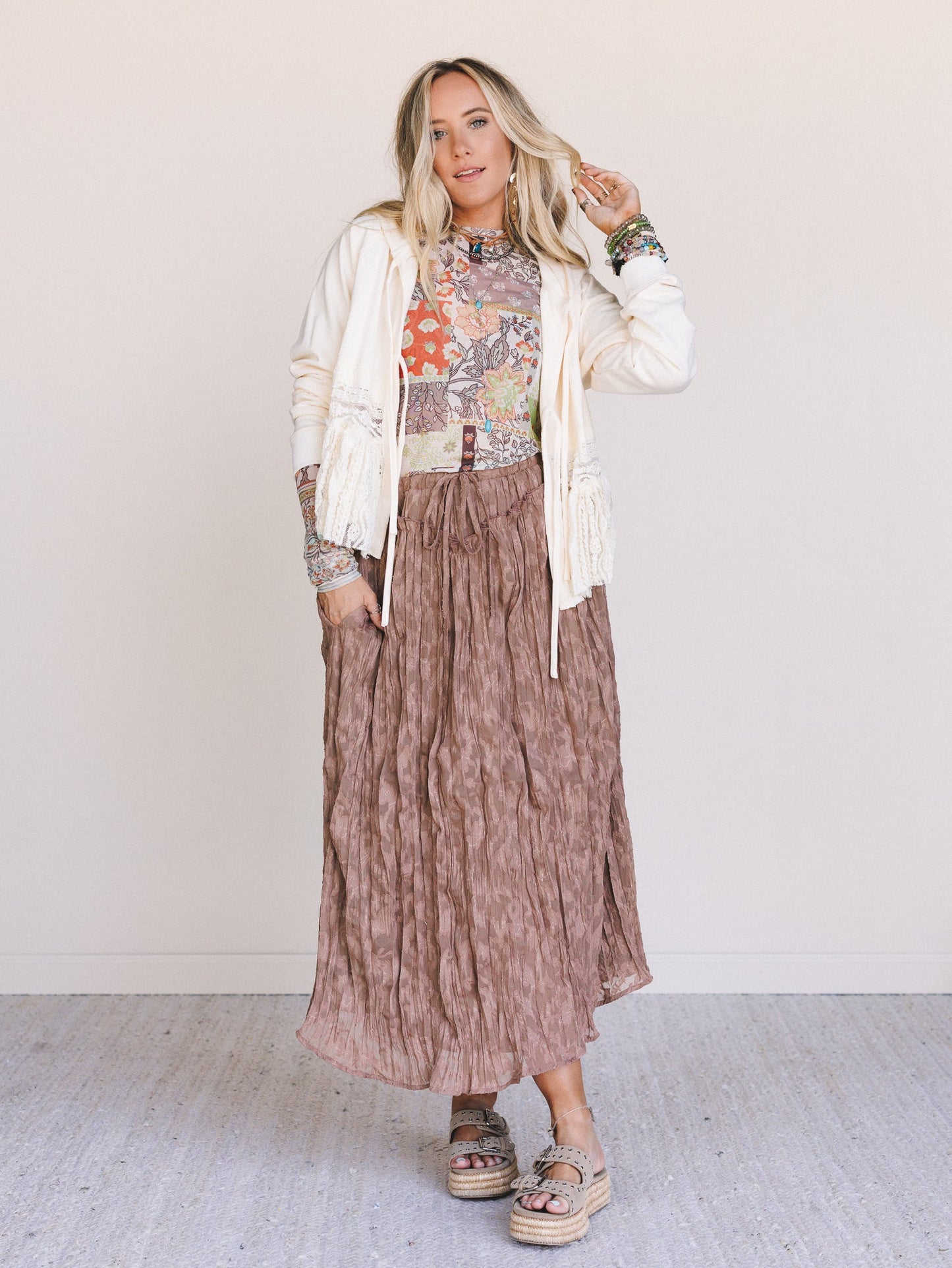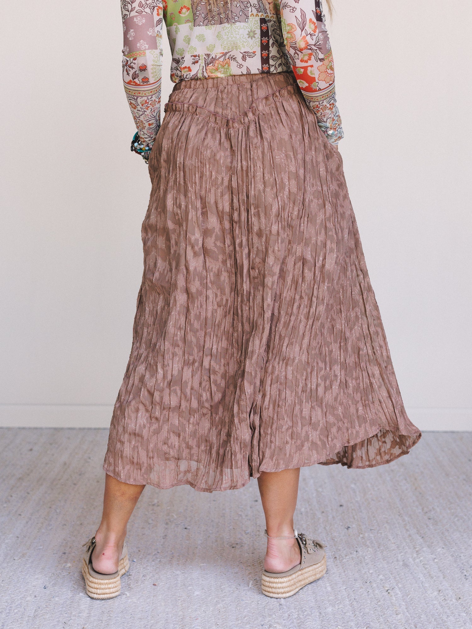 - Flowy crinkle maxi skirt with a tonal floral pattern and soft brown hue