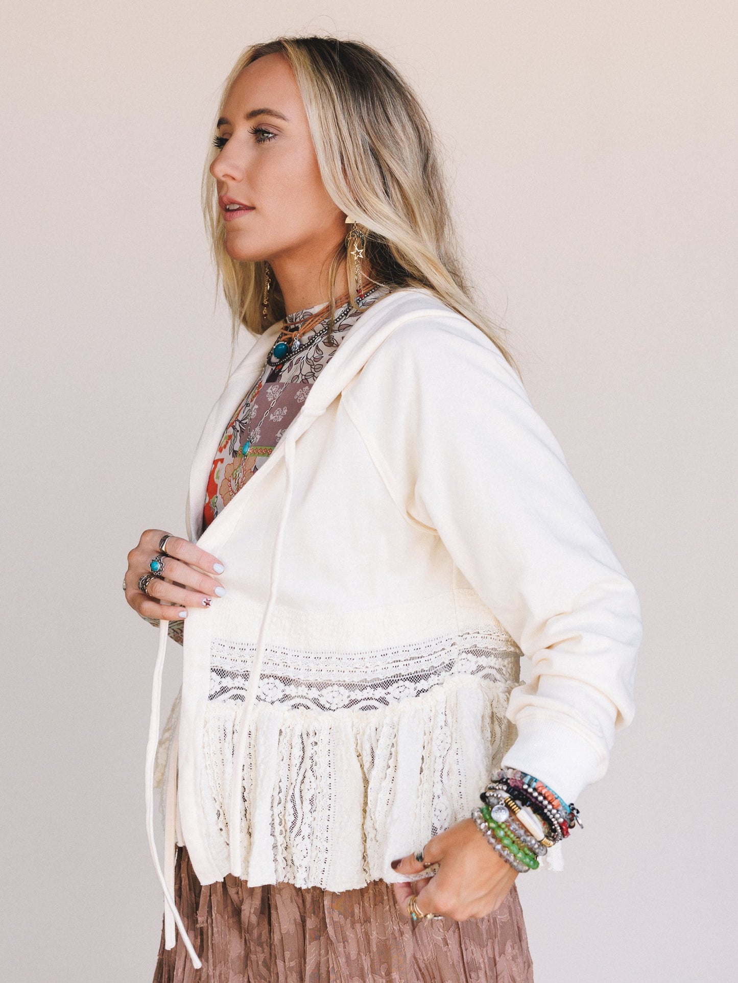 - Cream hoodie with crochet and lace trim that adds just the right vintage charm
