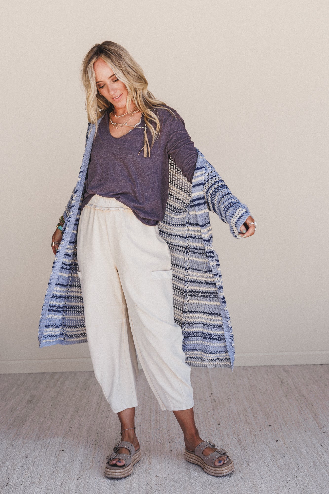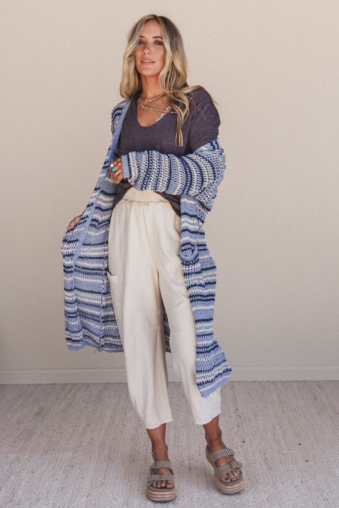 - Textured striped cardigan in calming shades of blue and cream for all the boho feels