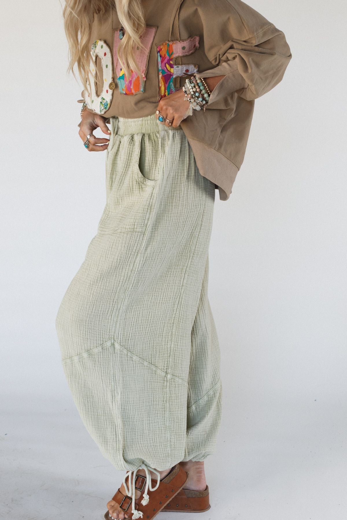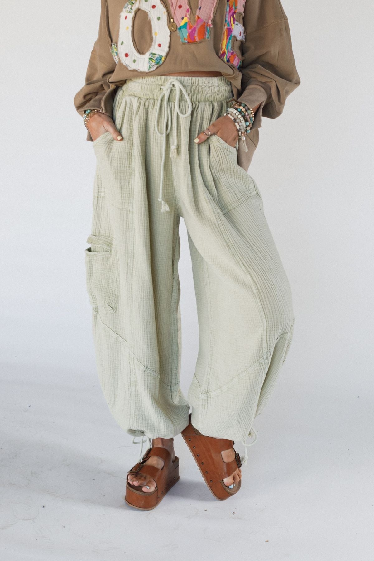 Parachute pants aren’t going anywhere. Get in on this timely trend with the Cool Coast Wide Leg Pants in gorgeous pale green.