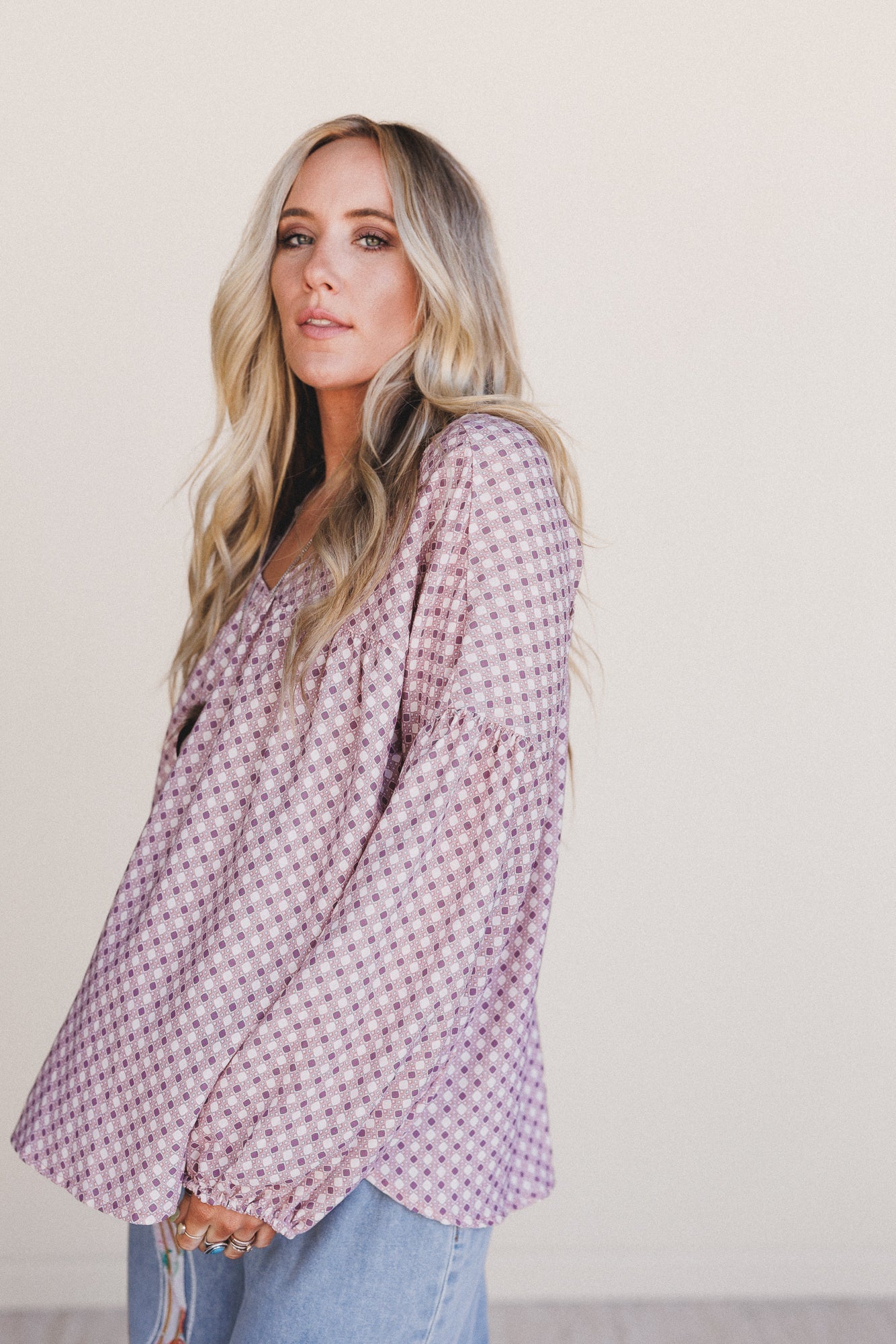 - Flowy long sleeve top with elastic hem and neckline tie for adjustable styling