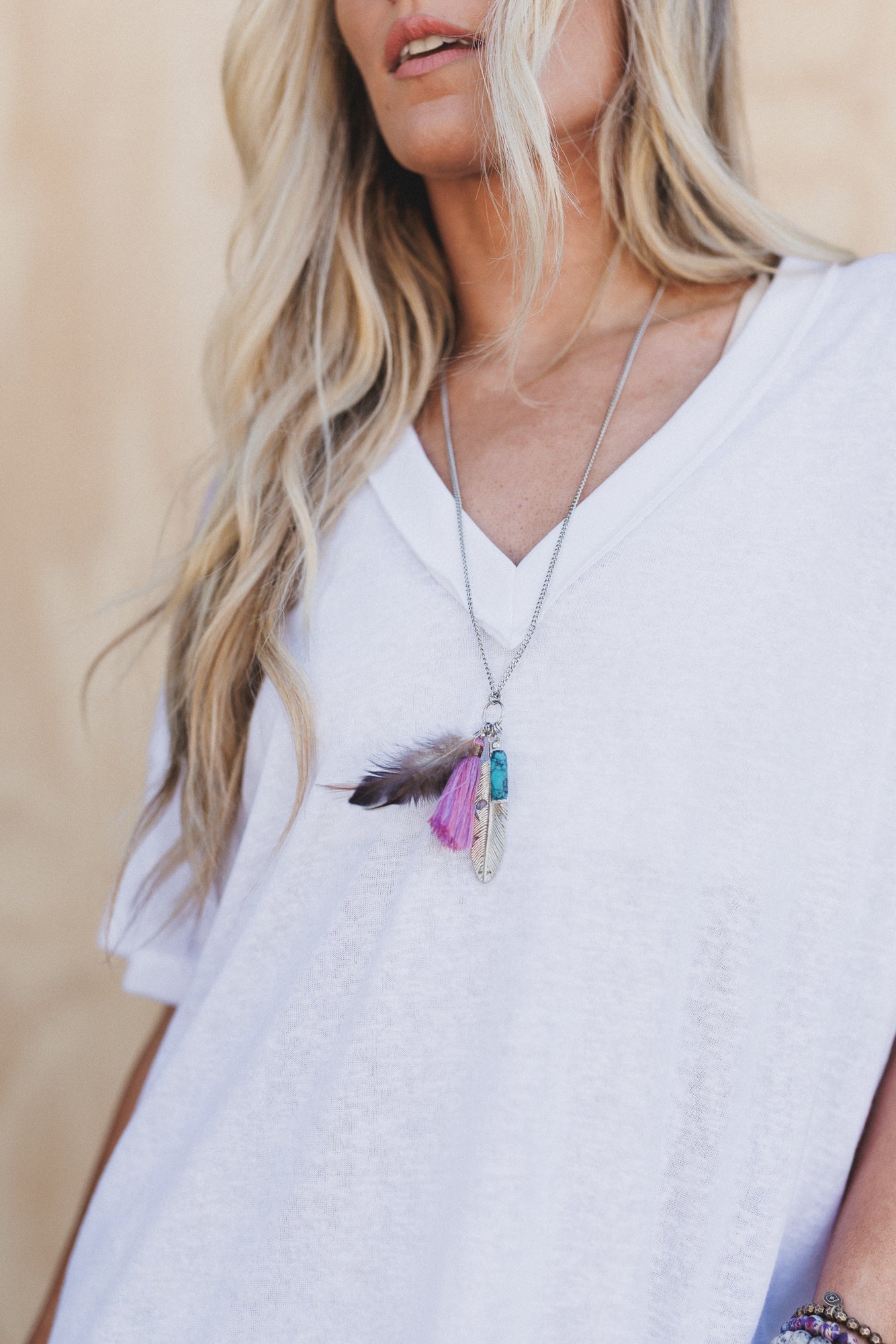 This look combines a basic with a statement and ties it all together with a pop of color in the necklace.