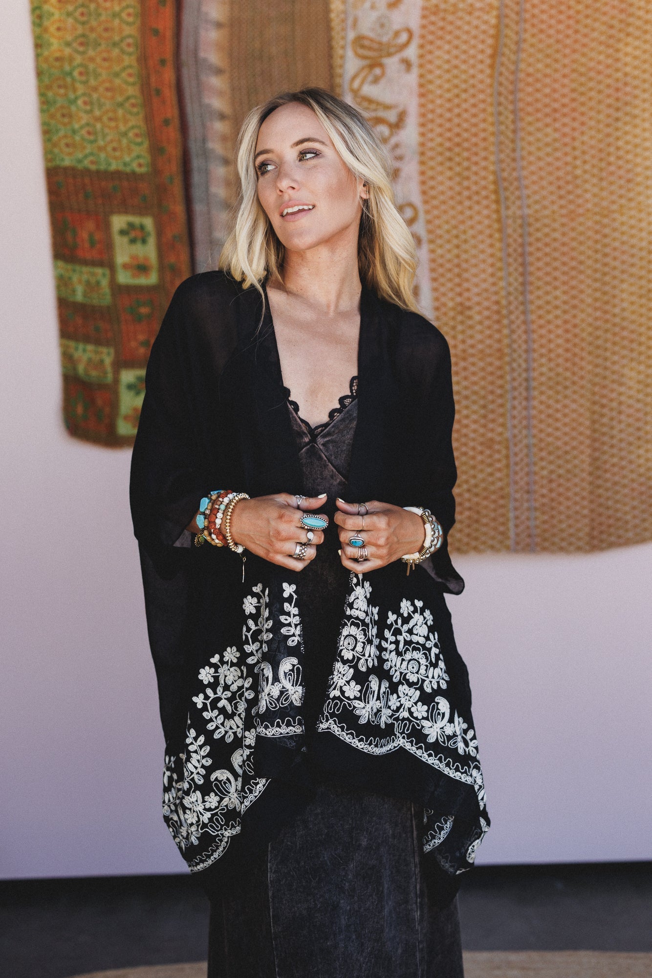 - Pair this light and flowy kimono with a brami and jeans for an easy elevated casual look.