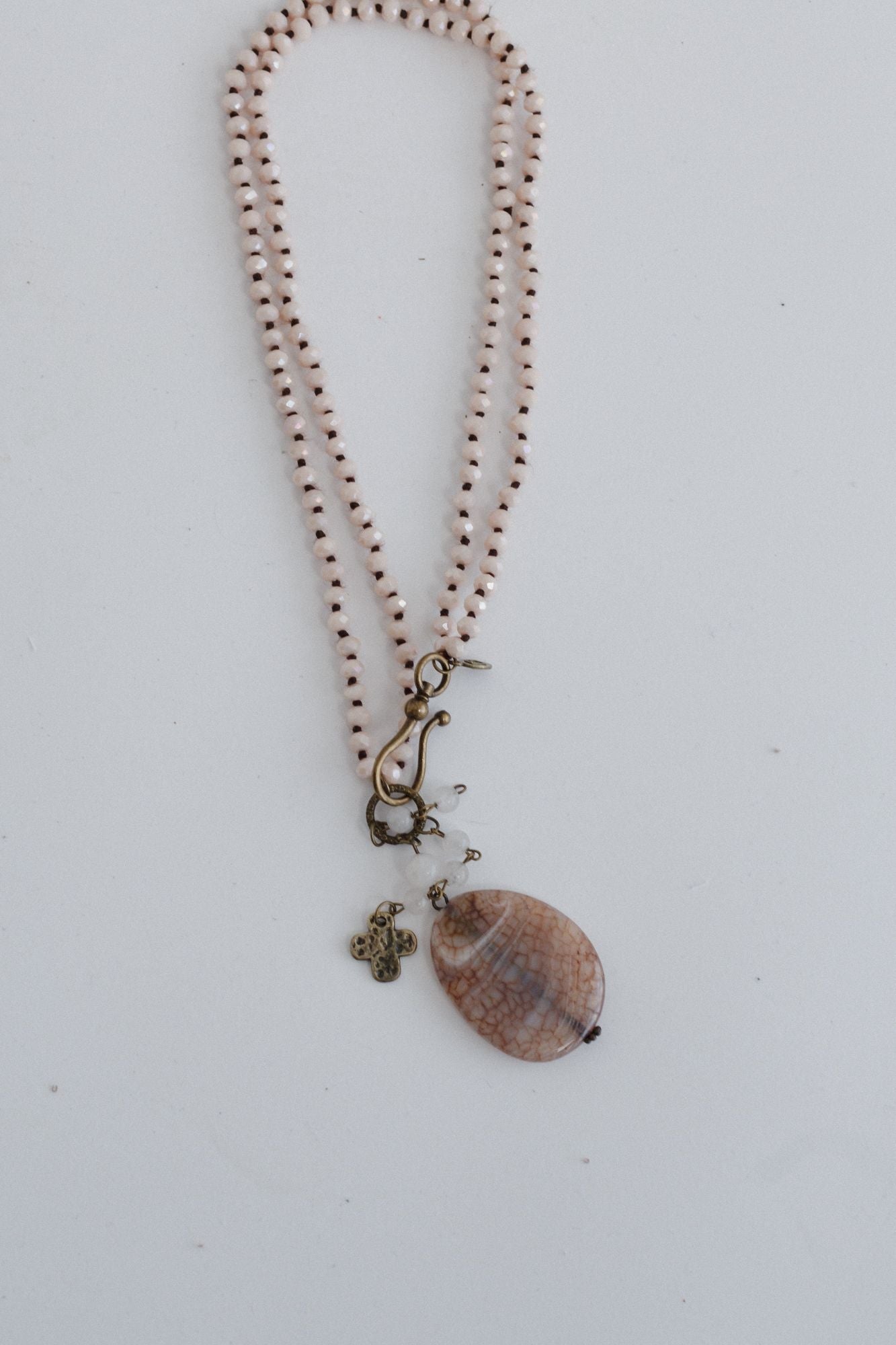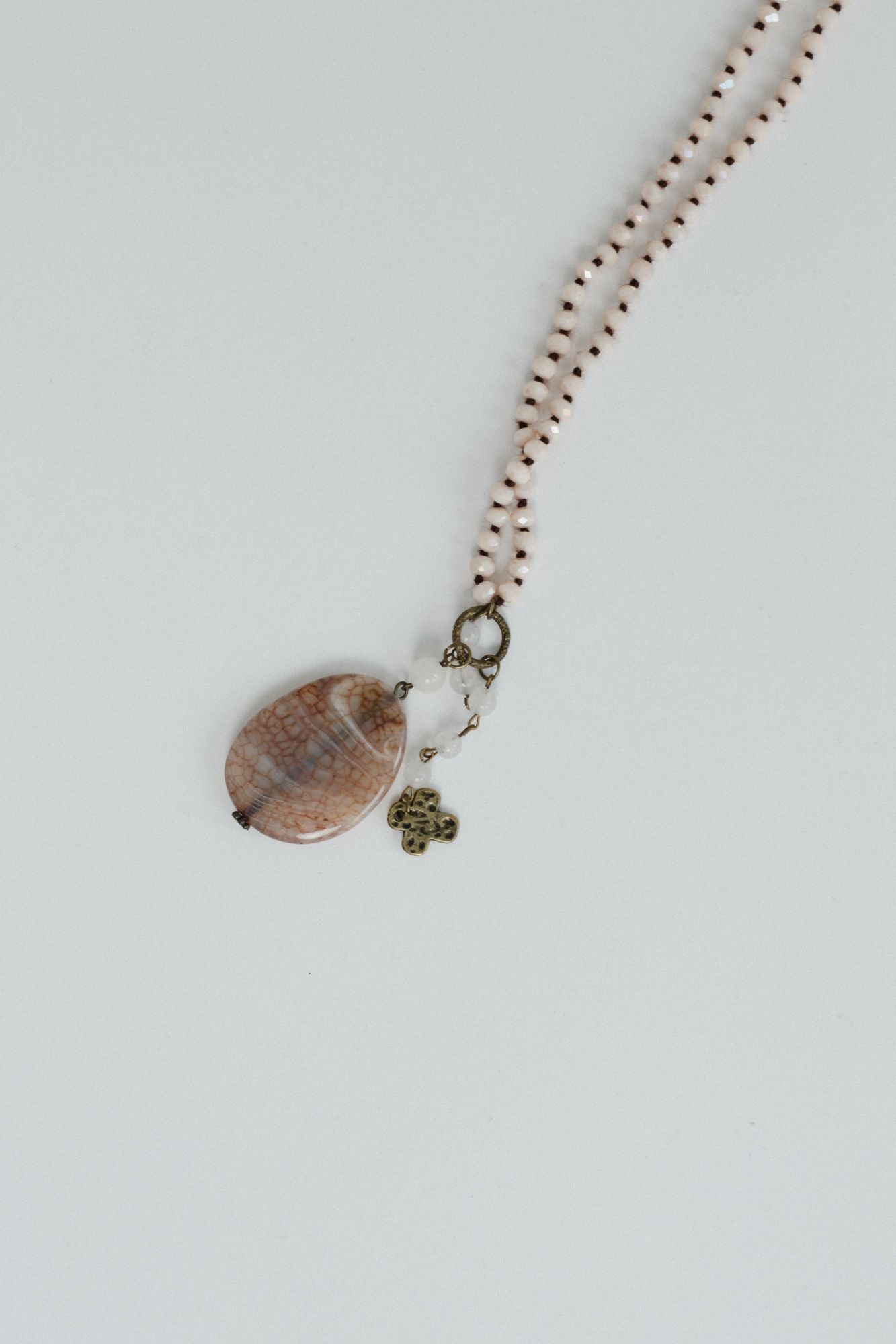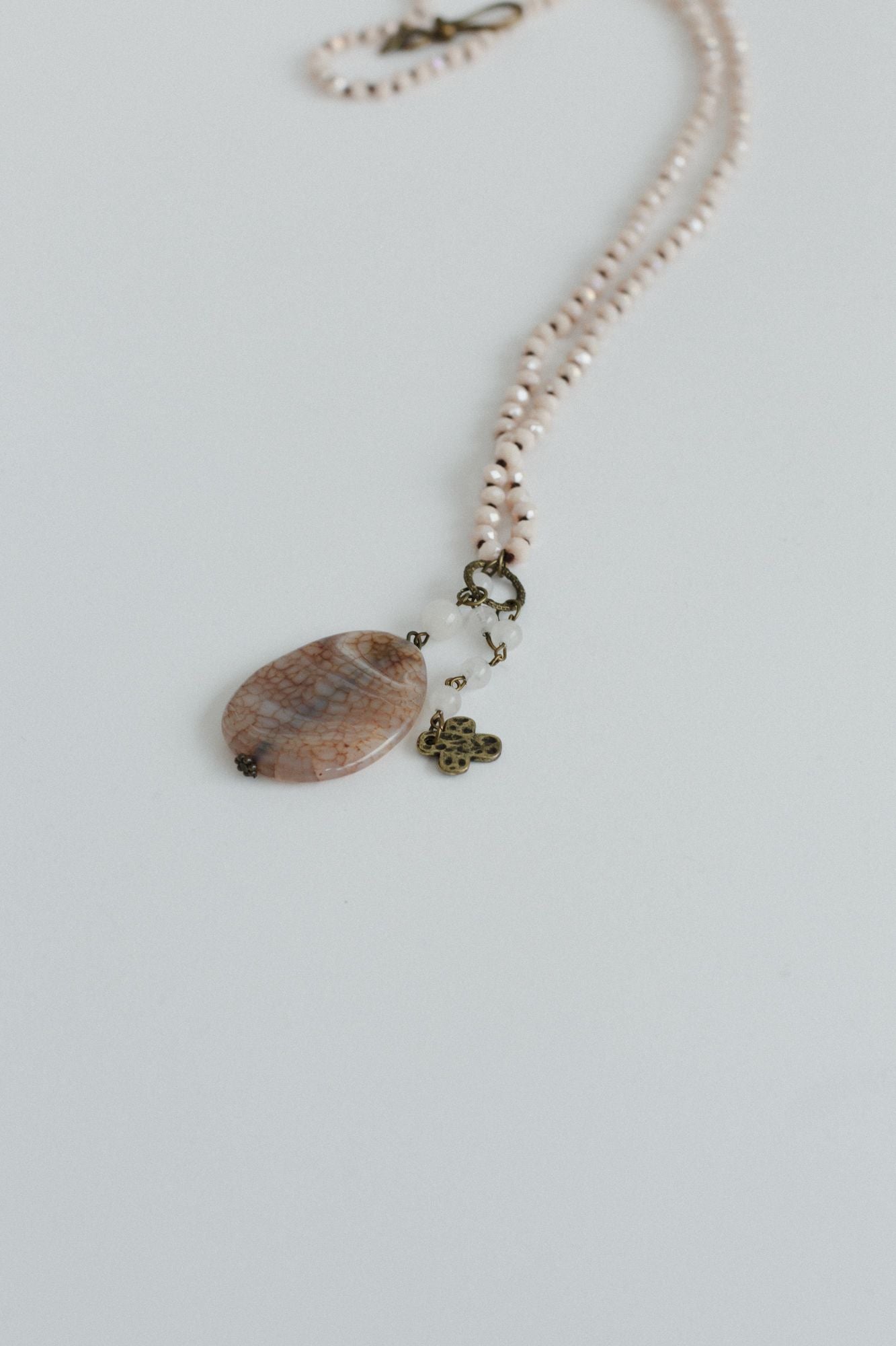 - Unique statement detail including a polished agate stone, a small bronze cross, and a pretty teardrop bead