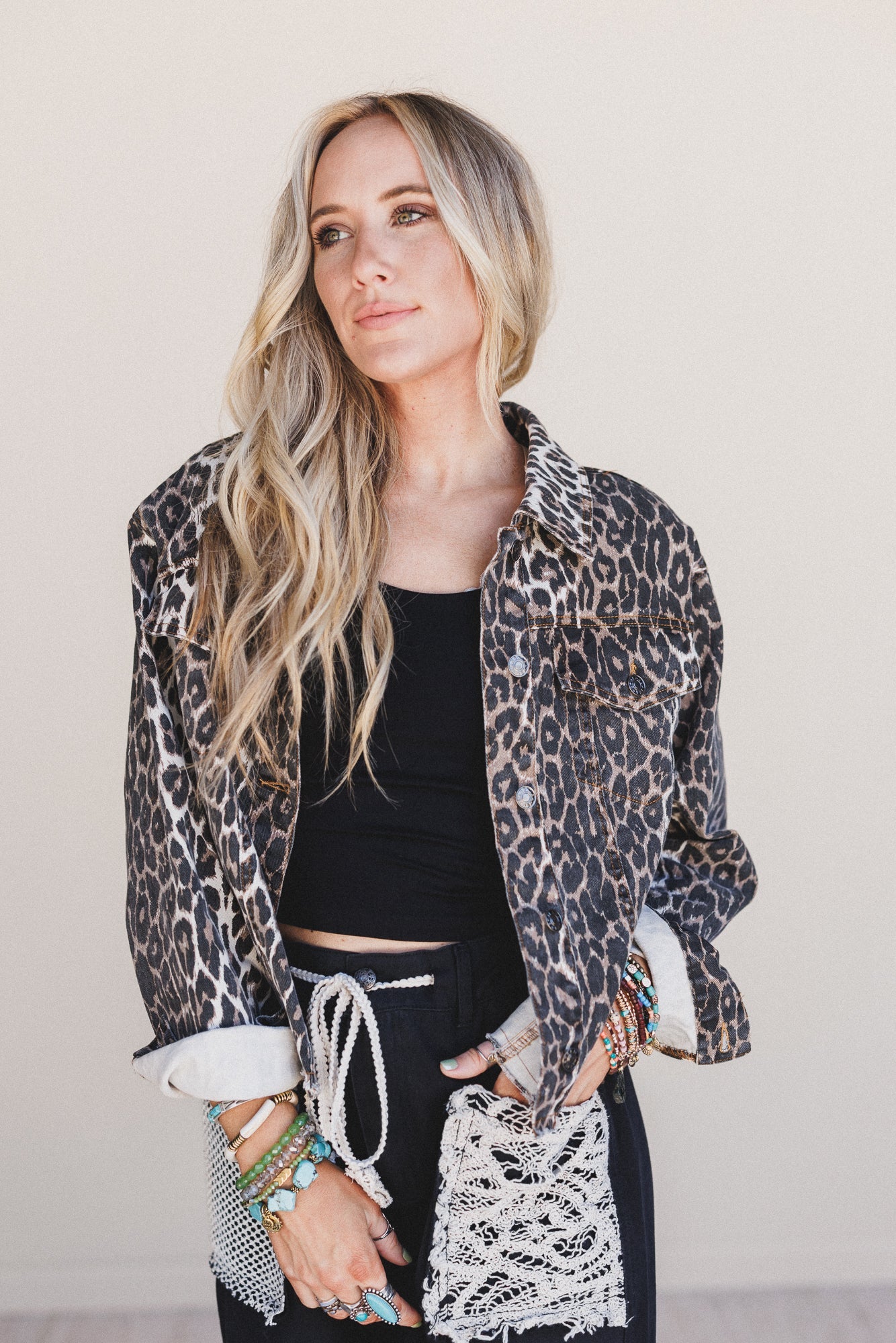 - Cropped leopard denim jacket that adds instant attitude and pairs with anything