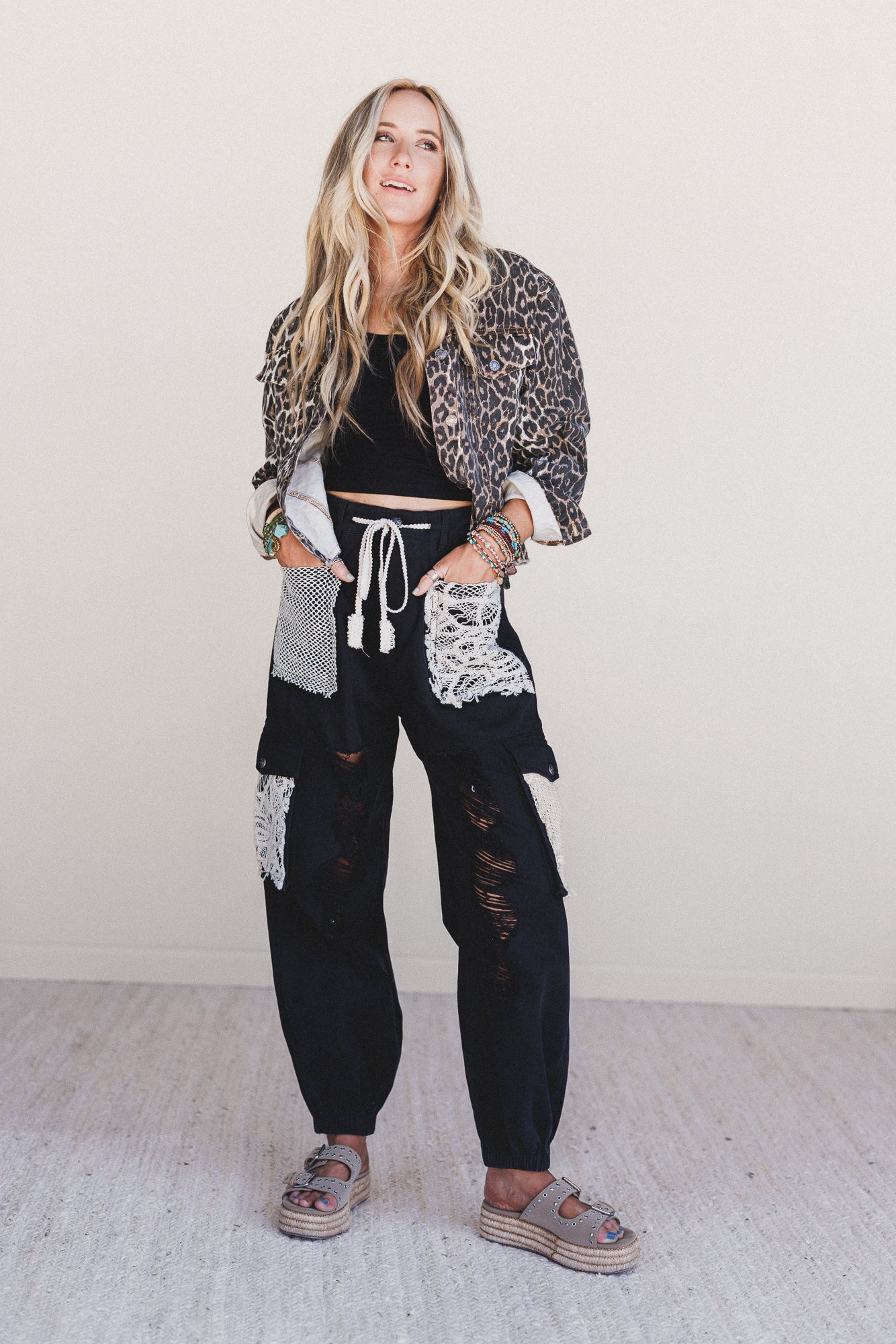 - Distressed jogger-style pants with mesh and lace patchwork details for that worn-in, one-of-a-kind vibe