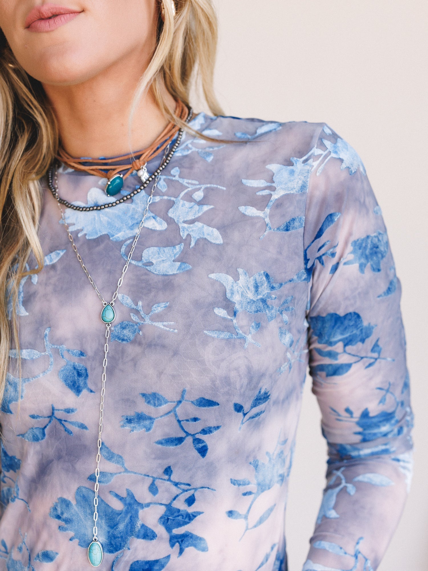 - Dreamy mesh fabric with blurred floral print in cool blue hues