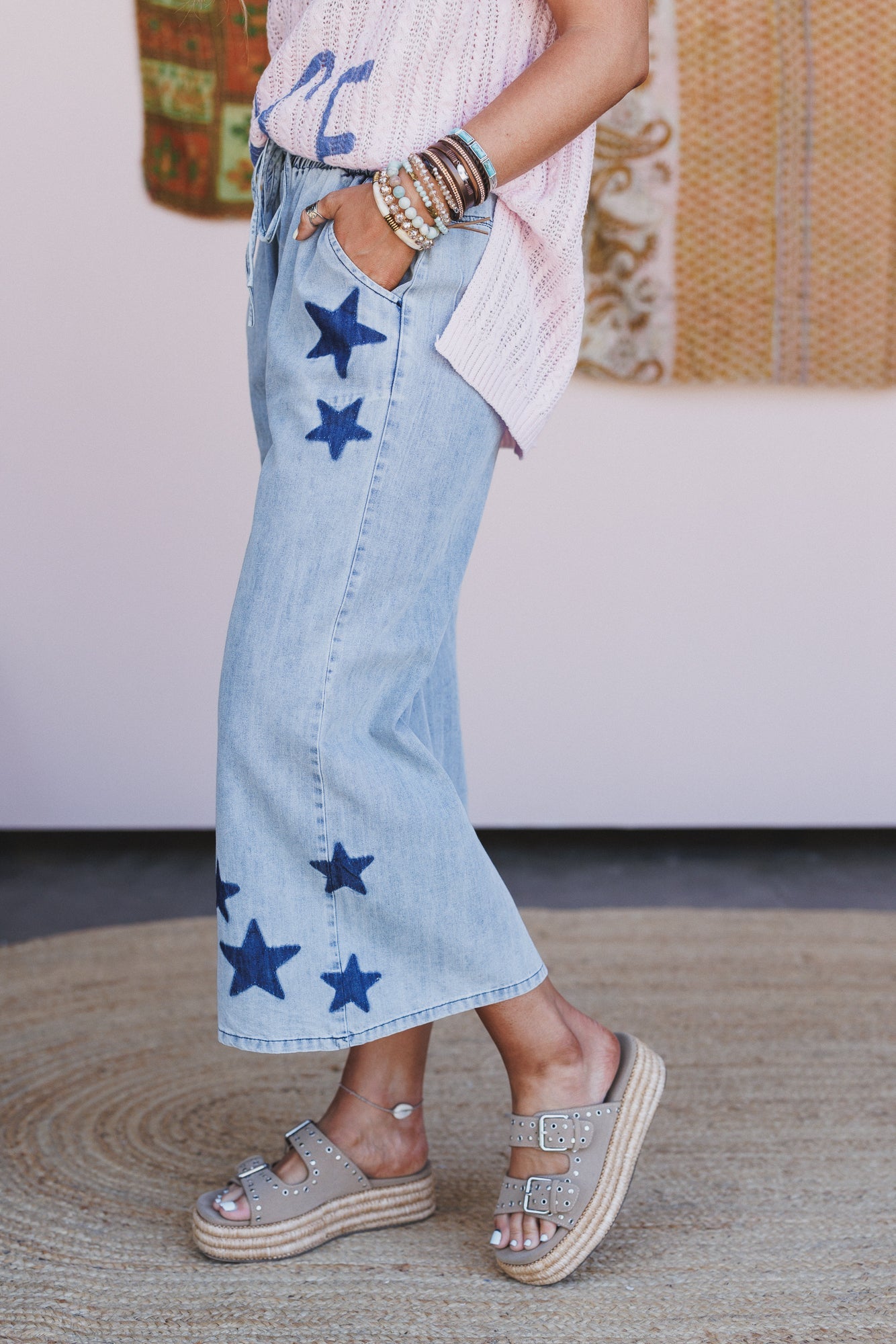These wide leg star pants pair perfectly with graphic tees and sneakers for an elevated casual look.