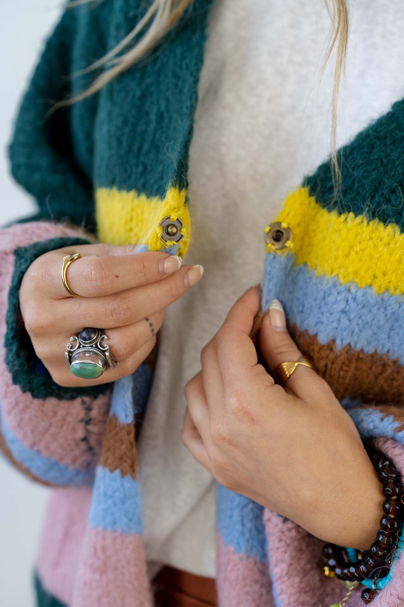 Our Retro Babe Striped Cardigan is the perfect piece to brighten any fall day! It features an oversized silhouette in a soft knit, with multicolored stripes, dropped bishop sleeves and a single snap closure at the bust. A little bit retro and a whole lot of fun for your wardrobe!