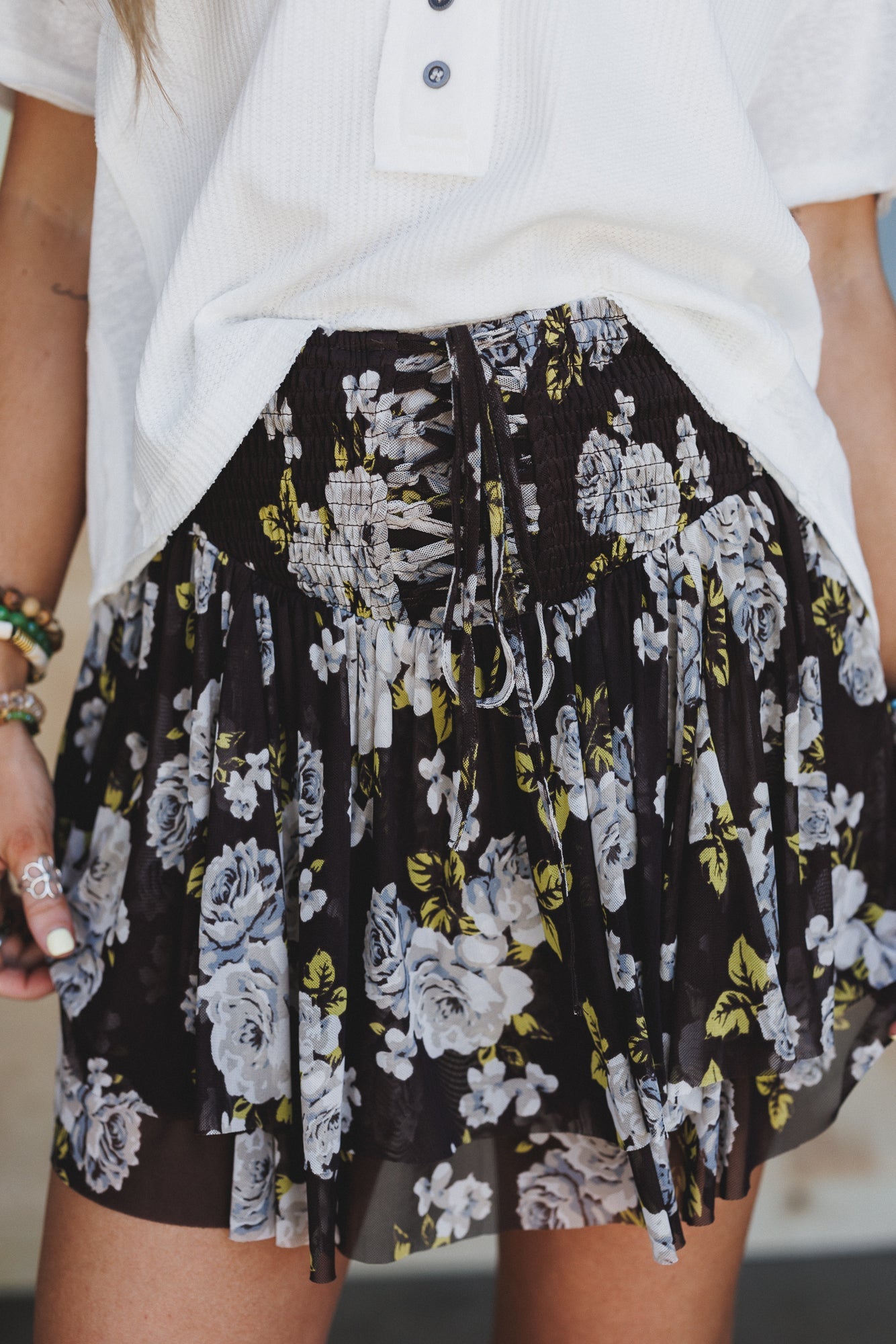 - This flirty floral mini skirt pairs perfectly with sheer lace tops for an ultra femme look.