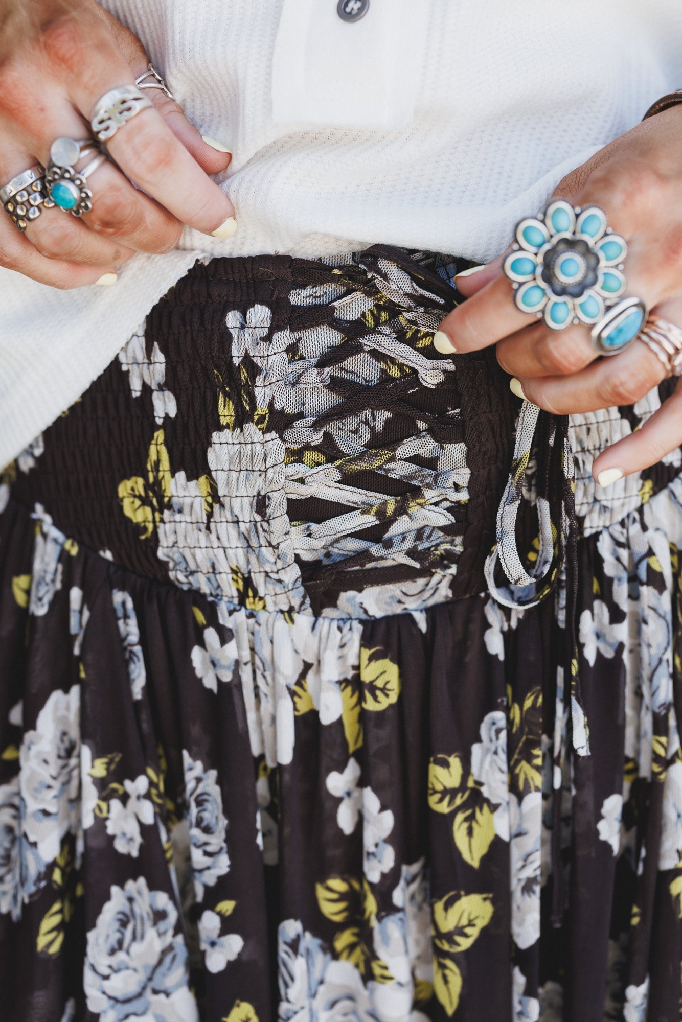 This flirty floral mini skirt pairs perfectly with sheer lace tops for an ultra femme look.