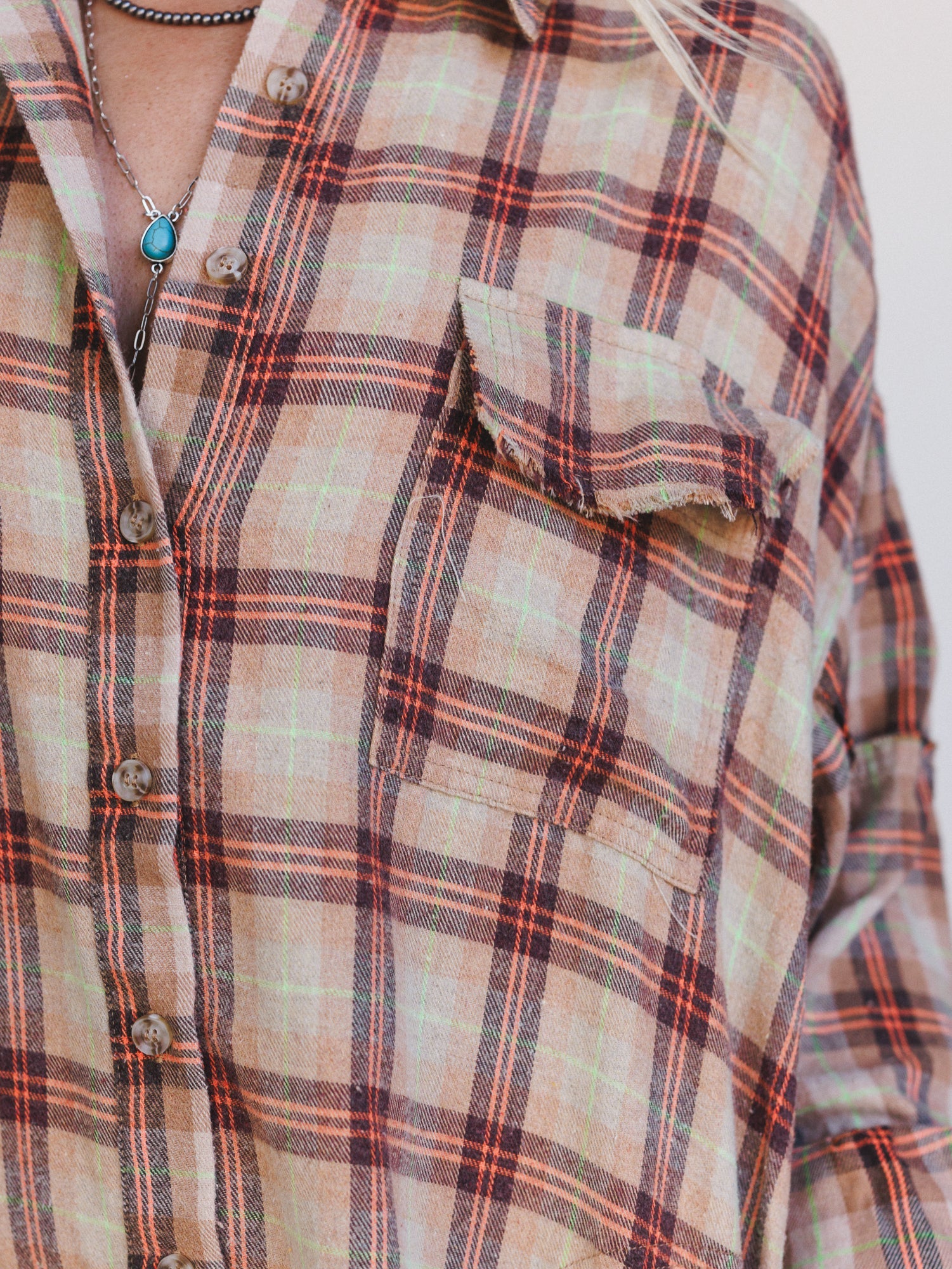 • Distressed plaid print with raw hem for that perfectly lived-in vibe
