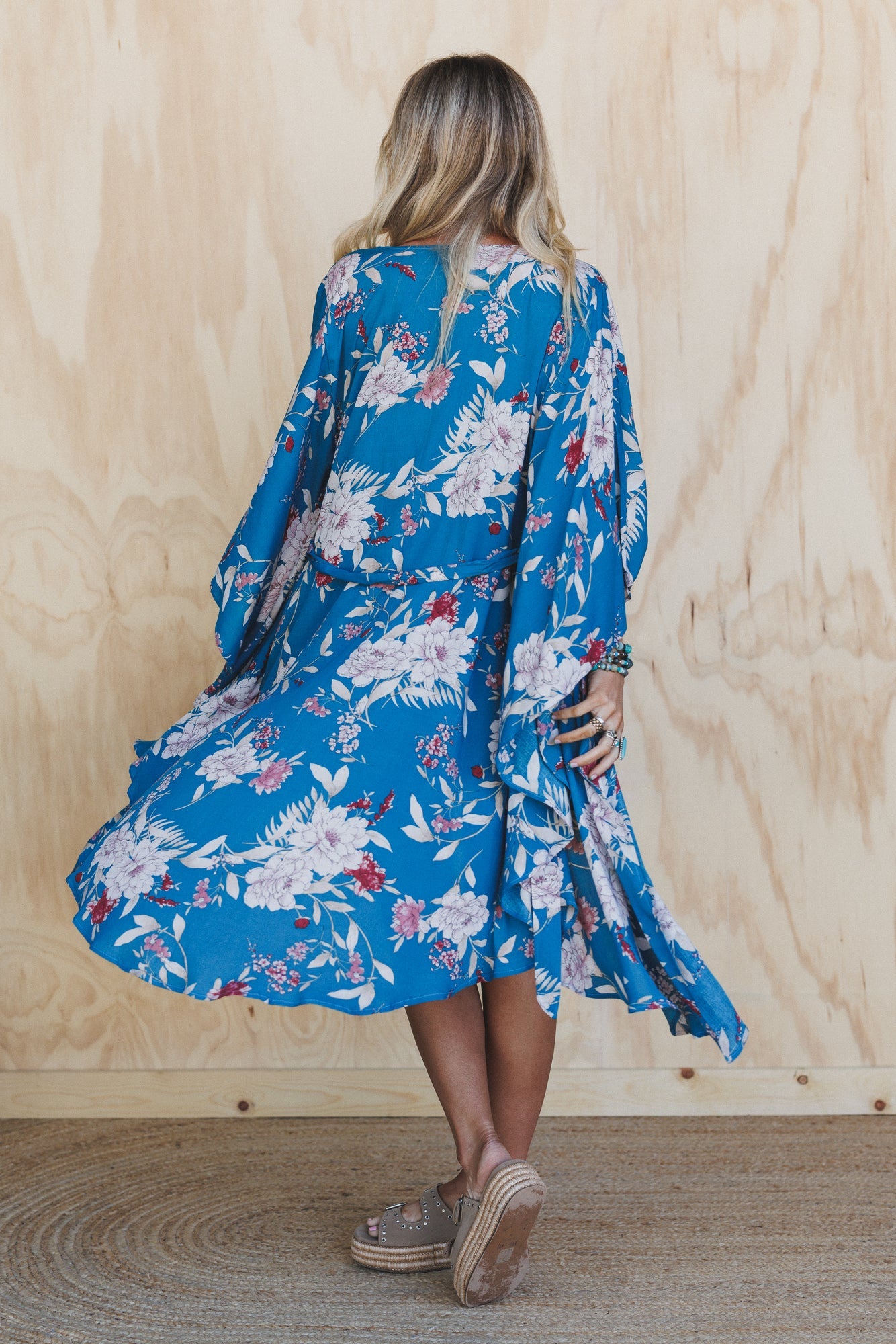 - A beautiful, flowy kimono featured in a lightweight, breathable fabric with butterfly sleeves, a maxi length, and a floral pattern.