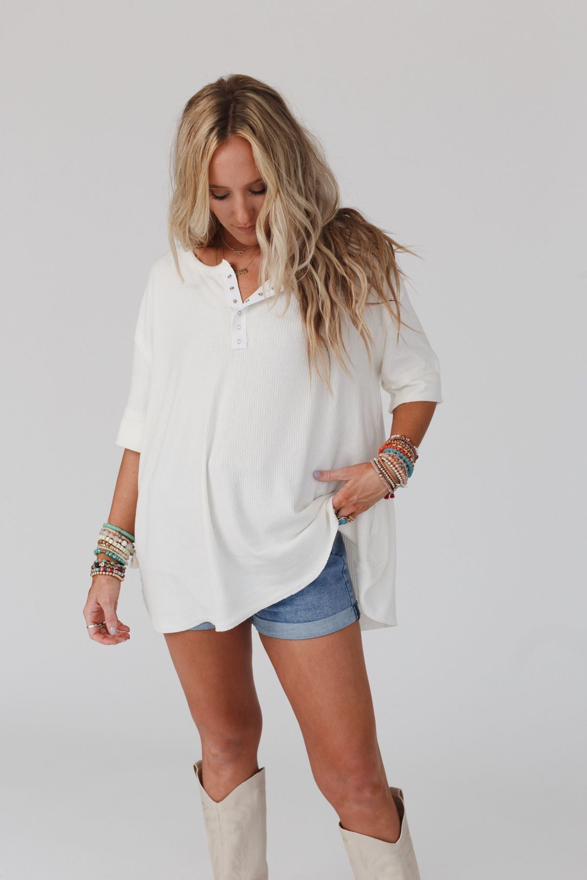 - Henley snap button front closure (perfect to show off your cute bralettes!)