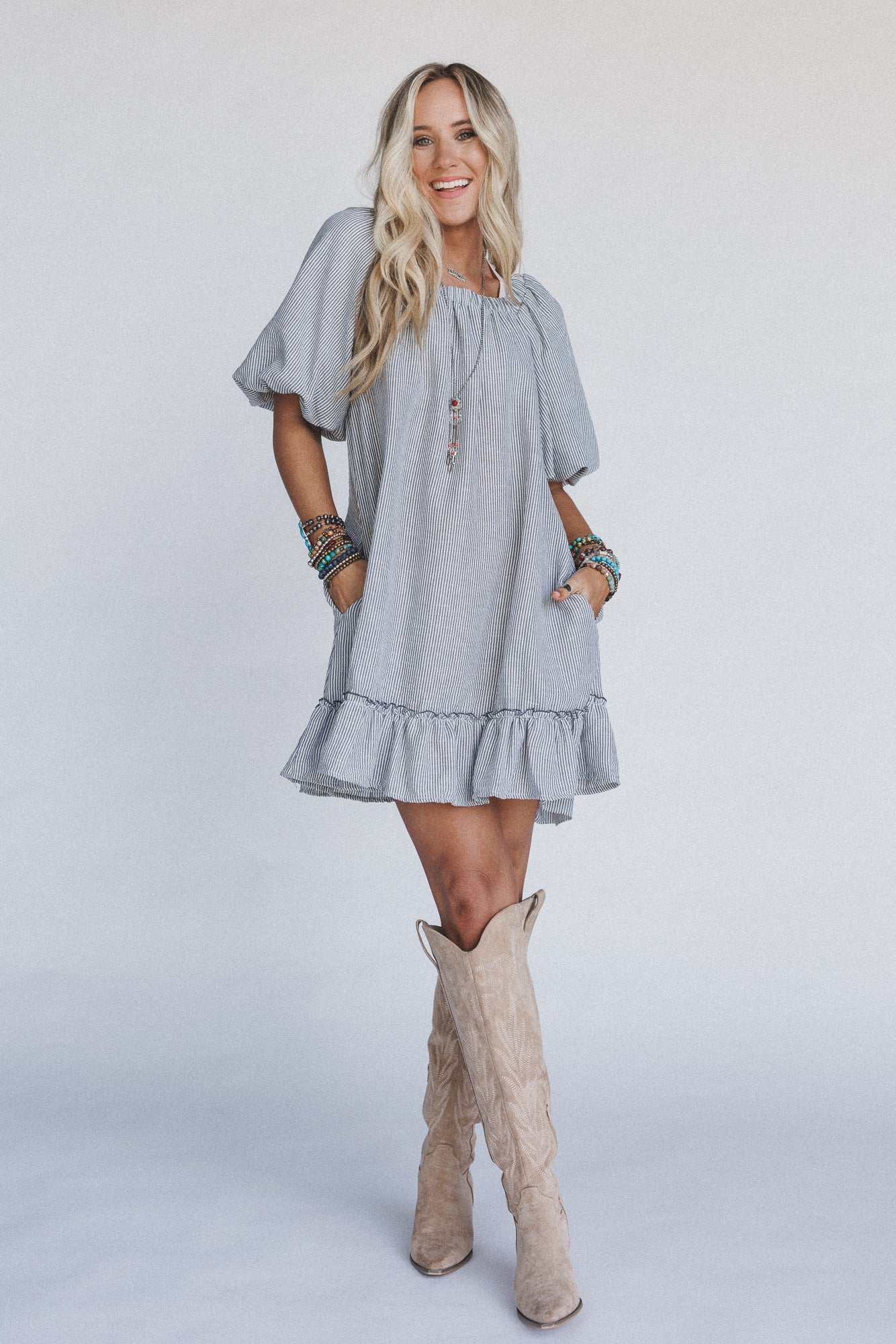 Excited to bring you the Solace Ruffled Hem Dress from our exclusive collection; The Nest by Three Bird Nest. Check out the rest of the collection here. Wear this ruffle boho dress with tall boots for a cool night out look.