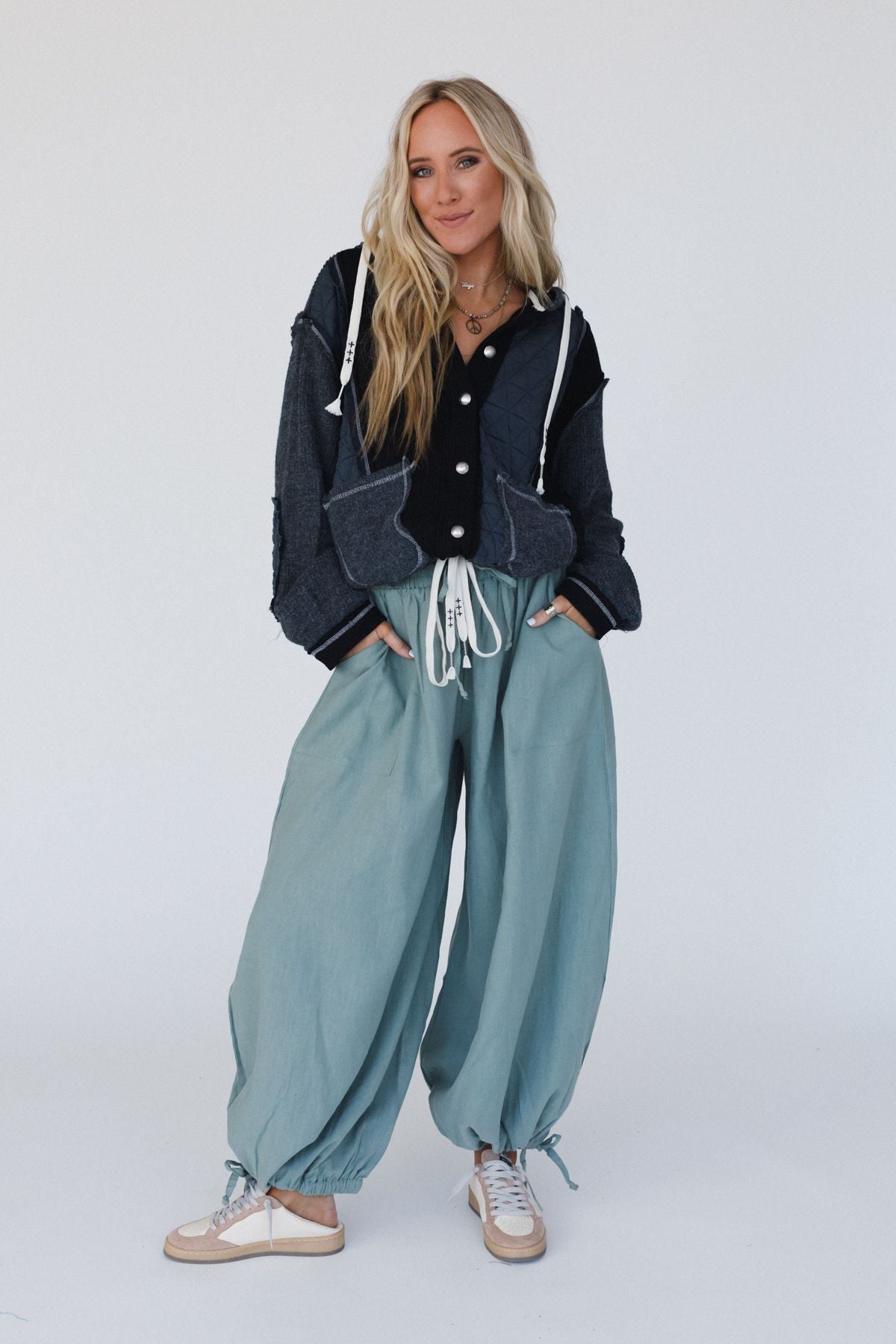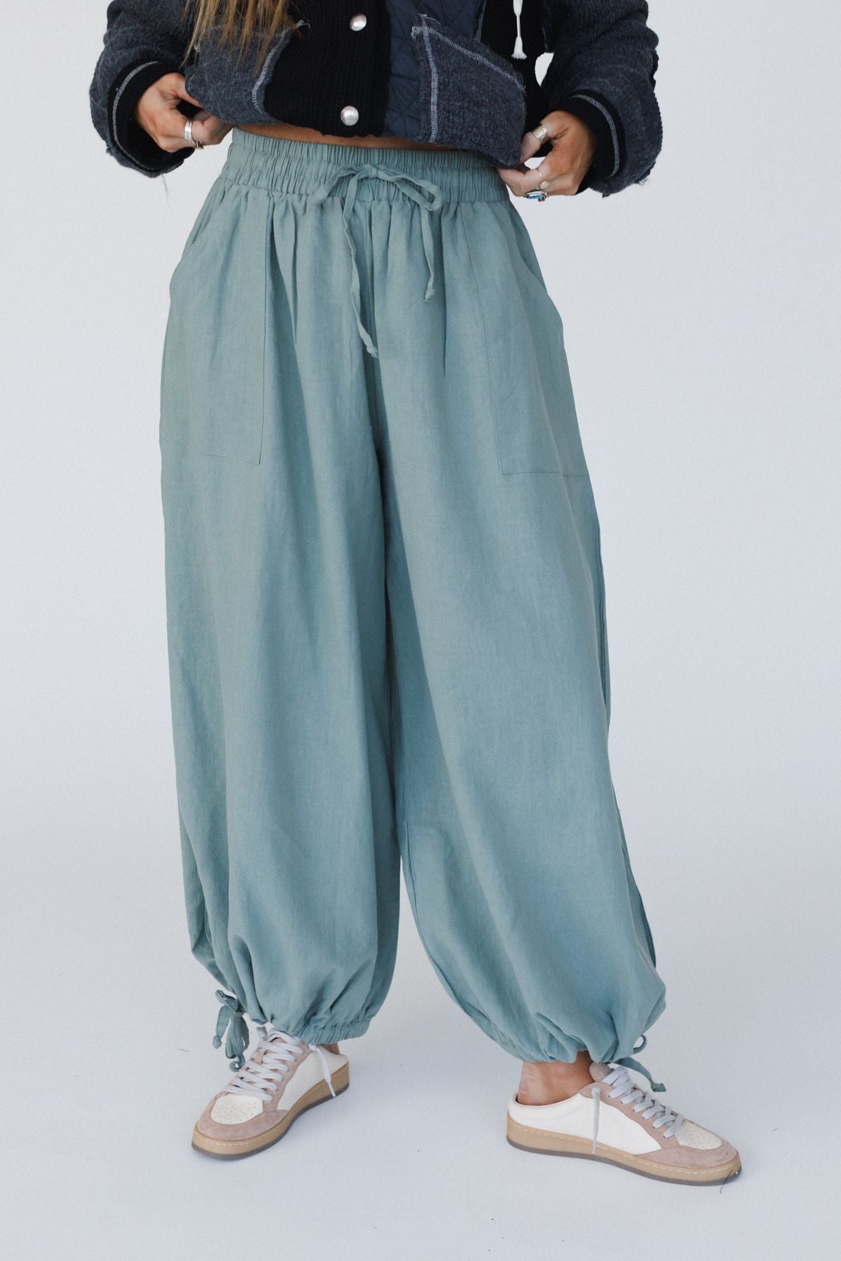 • Cute gathered elastic ankle closures with drawstring