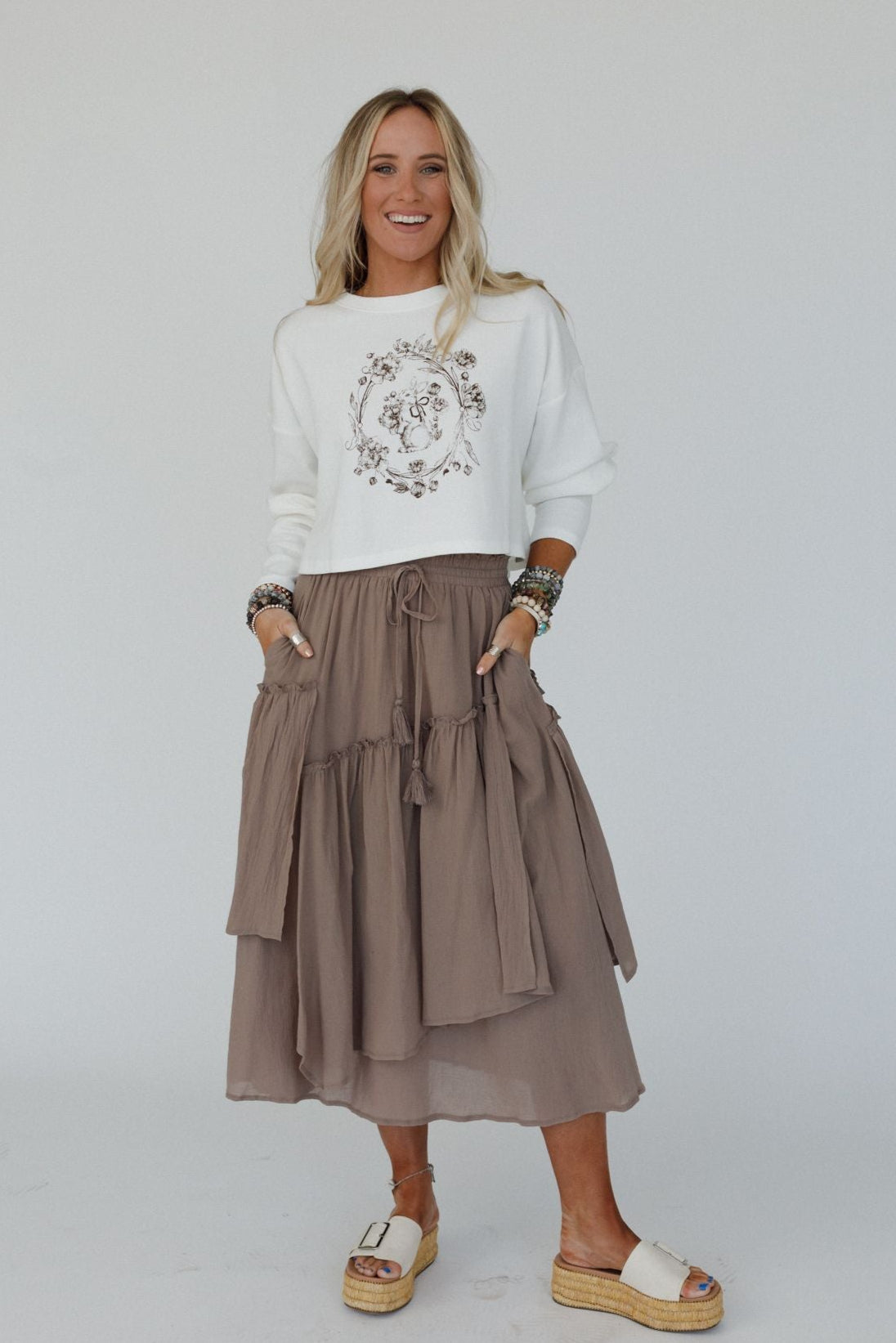 This unique taupe maxi skirt pairs perfectly with graphic tees and denim jackets for a casual cool look.