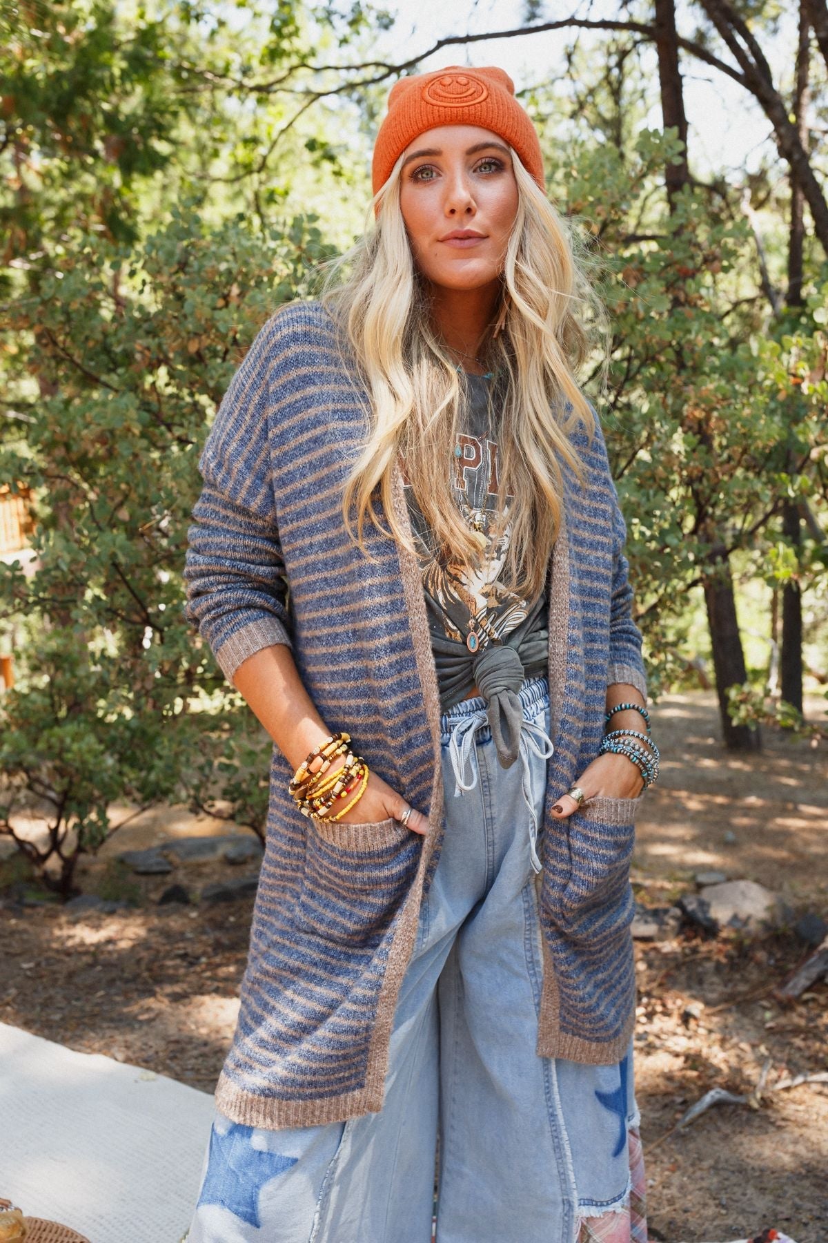 The ultimate boho sweater, perfect to add to any of your favorite outfits is the Wherever I Go Striped Knit Cardigan!